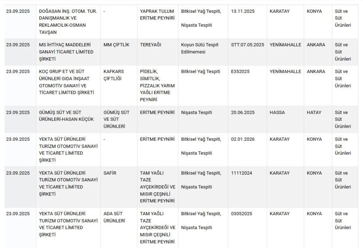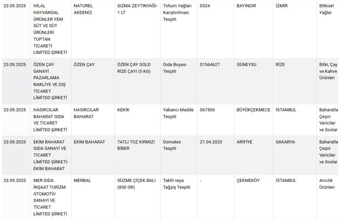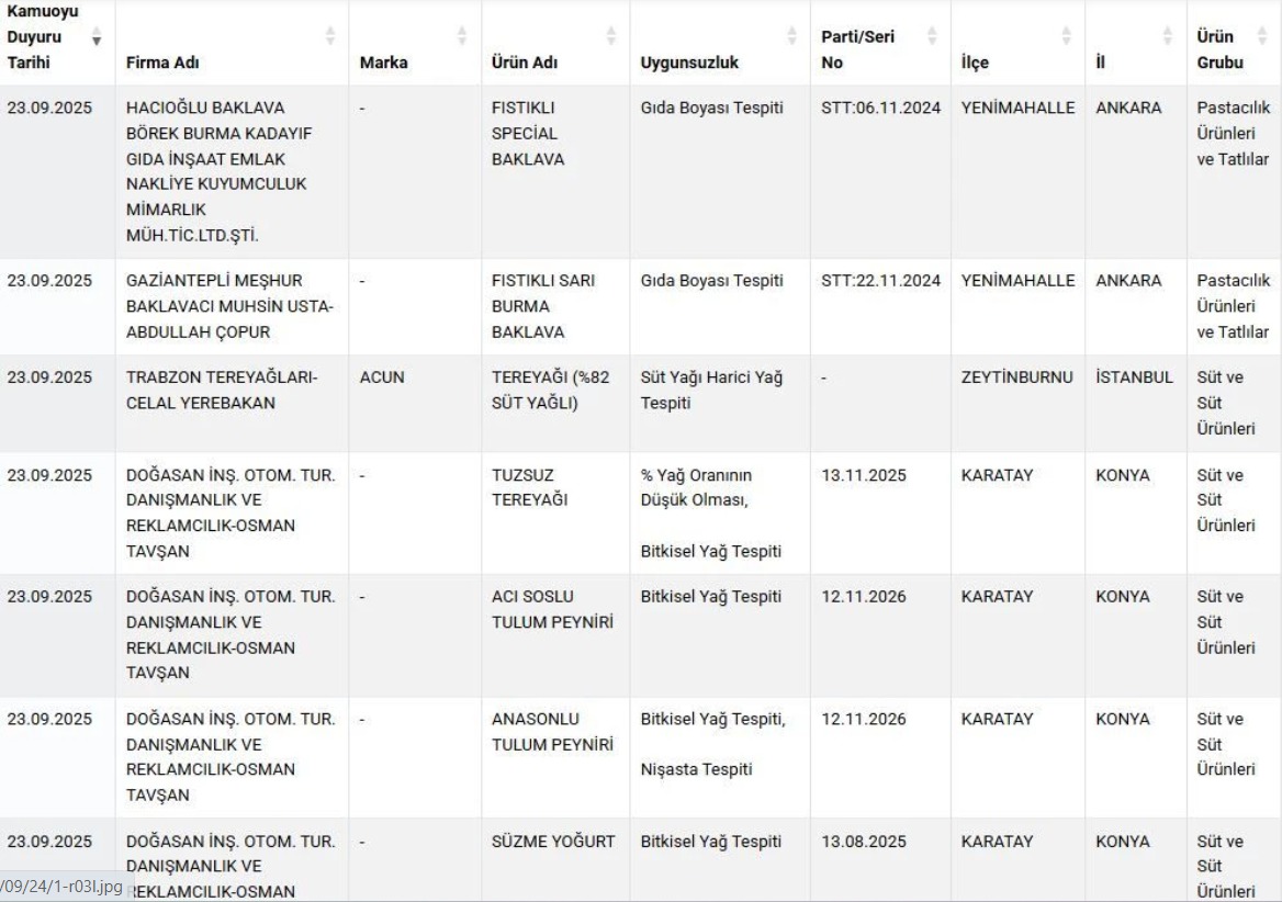 Tarım ve Orman Bakanlığı, sağlıklı gıdaya erişimi güvence altına almak için yürüttüğü denetimler kapsamında uygunsuz ürünleri ifşa etmeye devam ediyor. Bakanlığın güncellediği listede bu kez tatlı, peynir, yoğurt, yağ, şarküteri ürünleri, baharat, çay ve bal gibi pek çok gıda yer aldı.