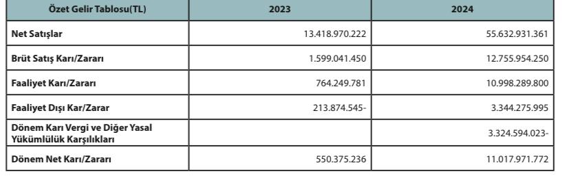 Brüt satış kârı da aynı şekilde yükseldi. 2023’te 1 milyar 599 milyon 41 bin 450 TL olan brüt satış kârı, 2024’te 12 milyar 755 milyon 954 bin 250 TL seviyesine çıktı.
