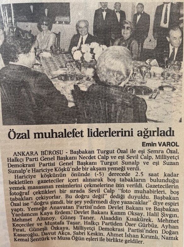 Başbakan Turgut Özal, 6 Kasım 1983 seçimlerinde yendiği, siyasi parti liderleri ile milletvekillerini yemeğe davet etti. Dışişleri Köşkü’ndeki yemeğe HP Genel Başkanı Necdet Calp ve eşi Sevil Calp, MDP Genel Başkanı Turgut Sunalp ve eşi Suzan Sunalp ile çok sayıda muhalefet milletvekili katıldı. Köşkün önünde -5 derecede 2,5 saat bekletildikten sonra fotoğraf çekmek için içeri alındık. Yemek servisi başlamadığı için boş tabakları çektiğimizi gören Necdet Calp’in eşi Sevil Hanım, “boş tabakları çekiyorlar” diyerek ev sahibi Turgut Özal’ı uyardı. Özal da Sevil Hanımı doğrulayarak, “’Özal, bir şey yedirmedi’ diye yazarlar” diye espri yaptı.